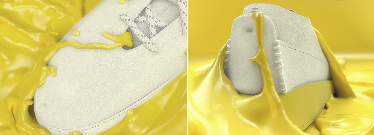 A dynamic liquid animation showcasing Clarks Originals Spring Summer 2019 ‘White Pack’ sports products: Kiowa Sport, Trigenic Evo and Trigenic Flex.